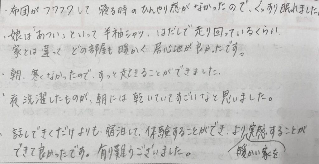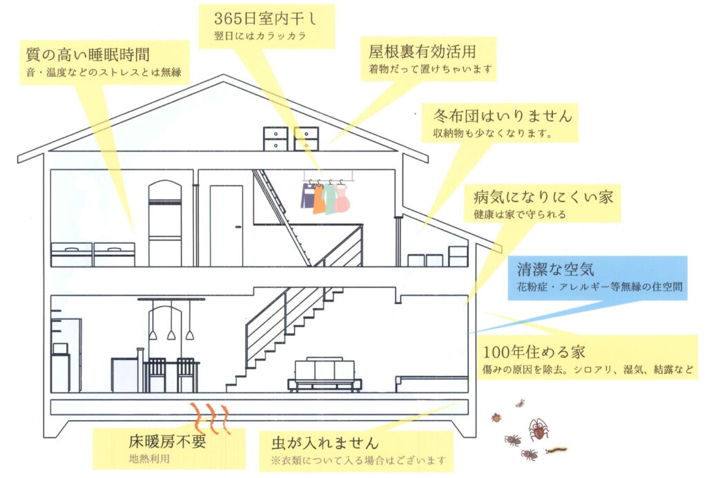 平成18年に新築して以来、信じられないような快適な住み心地・澄んだきれいな空気を守りつづけています。車は試乗して乗り心地を試すように・・・人生最大の買い物、毎日暮らす家こそ、その『性能・住み心地』をしっかりと試してみましょう。鼻炎等のアレルギーや花粉症・喘息等でお苦しみのあなた!建てて10年以上も経つモデルハウスに来てみませんか?アトピーや小児喘息のご家族をお持ちのあなた!お子様とご一緒の『体感宿泊』おススメいたします。